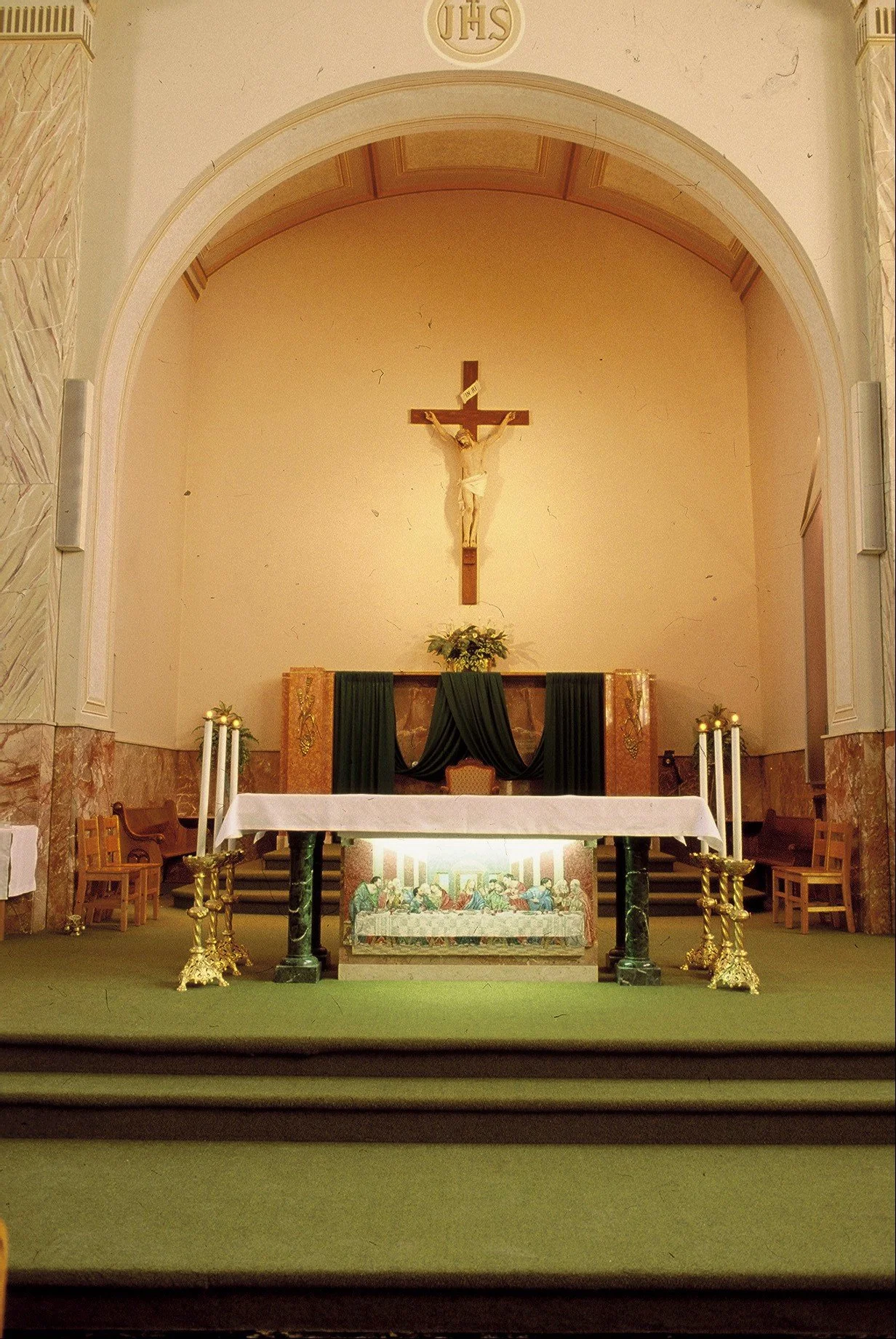 Work could only progress when Father Laboureau secured more funds, an ambitious undertaking for this little town and parish, but he persevered with his dream. The finished church was blessed and opened on December 11, 1902 by the archbishops of Toronto and Kingston and the Bishops of Peterborough and London. Cost was just under $50,000. When Father Laboureau passed away in 1908, his remains were brought back to his beloved Penetanguishene for burial. The day of his funeral, all businesses in the region shut down, to honour this amazing and holy man.